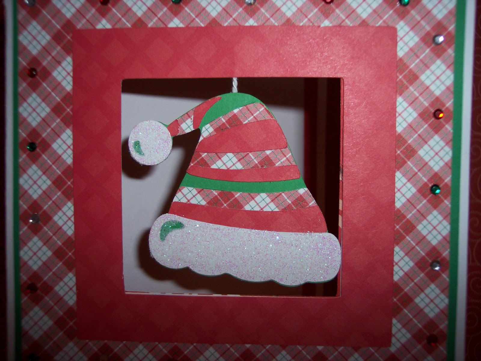 Instead of making a circle I decided to make a square. I still used the Wild Card cartridge for the base and cut it at 6 1/2". Since it is the holiday season I wanted to use the same color theme. I added glitter, gems, a button, and ribbon to put a smile on her face.